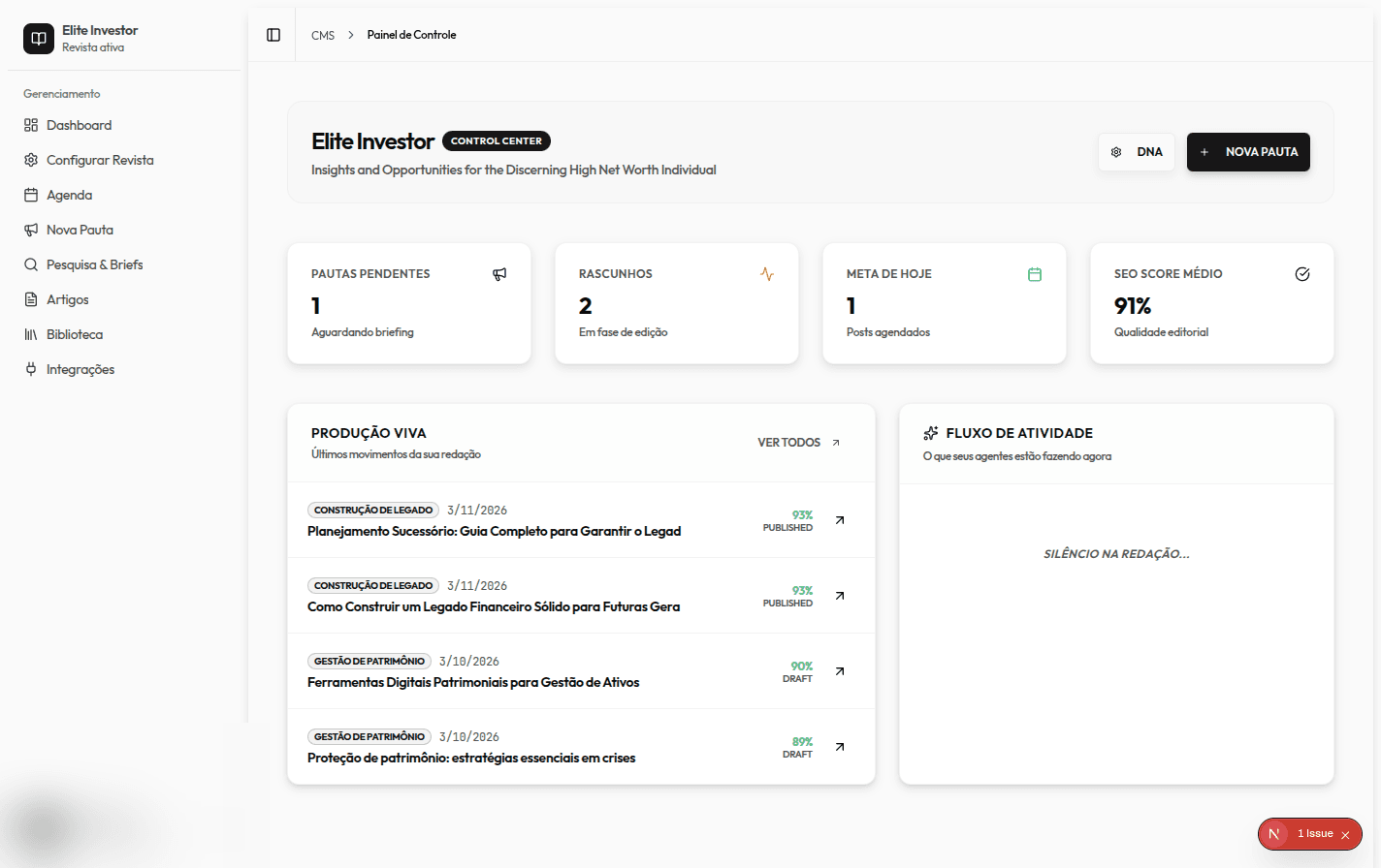 Revise e aprove briefs; a equipe produz os artigos completos.